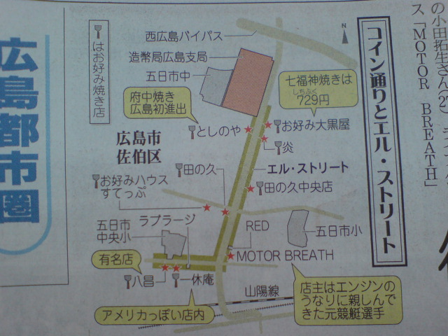 中区有名店、八昌の2号店や、府中焼き(ひき肉でモヤシ無し)1号店等をこの画像黄色地点を中心に「L字」ストリートと称して活性化を図ってるらしい。