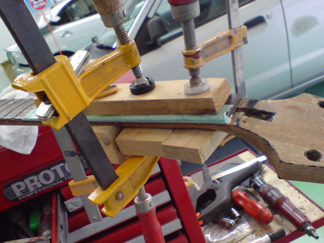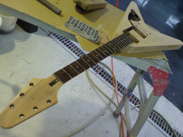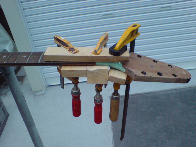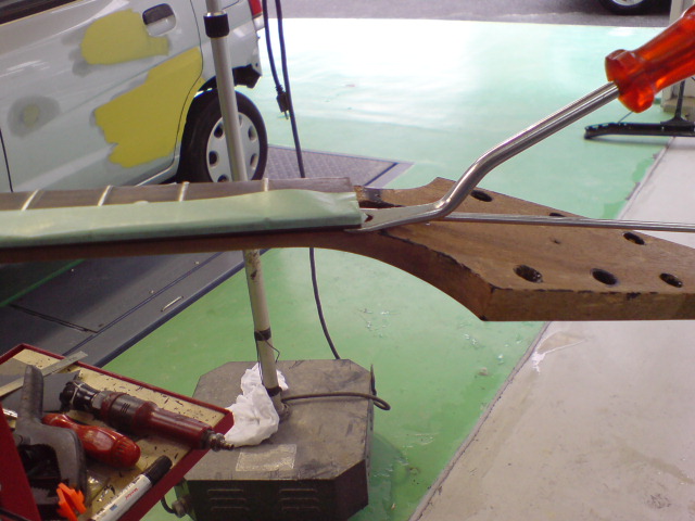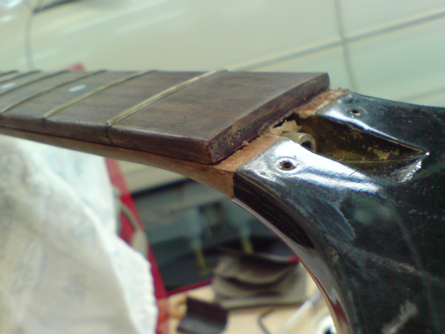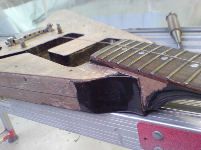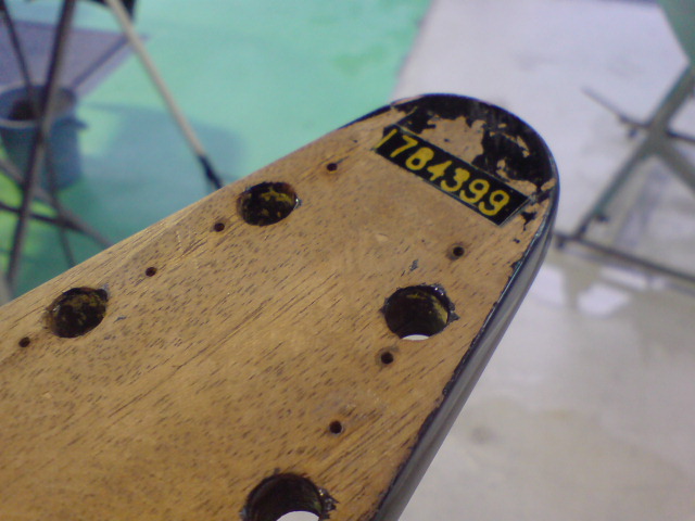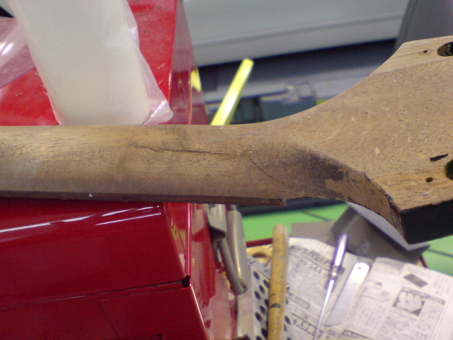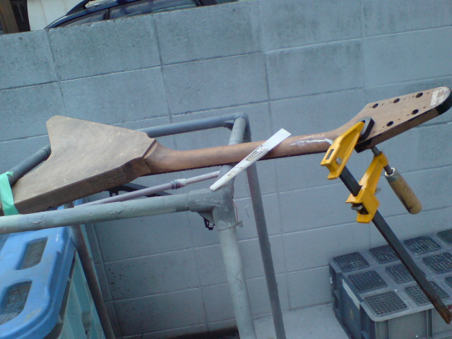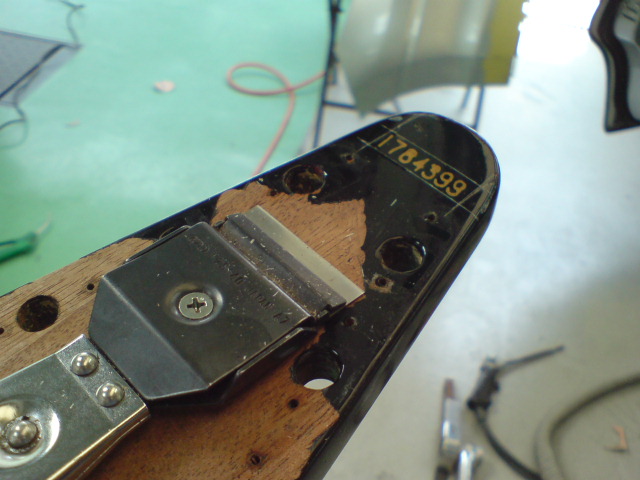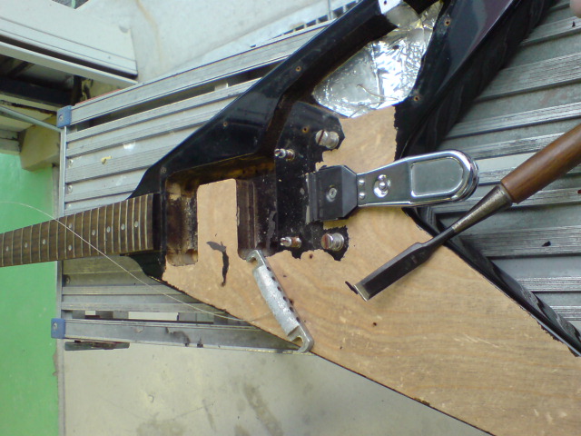 景気良く引っぺがすと、なんだかネックは赤みを帯びたマホガニーだがボディーは白っぽい単版、しかも縦に張り合わせ?