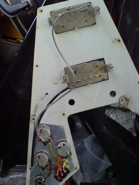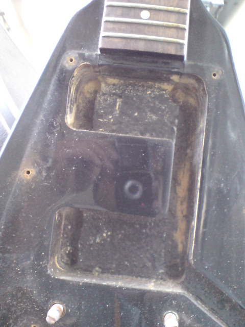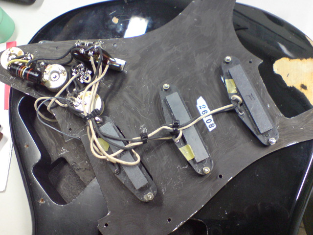 そしてピックガード裏にも......ここはアルミ&銅箔テープでもいいです、なぜかと言うと......