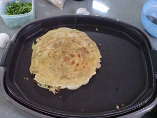 この画はほぼ完成ですが、前よりひっくり返して1分後、別のフライパンでいためた焼きそばを横で広げましょう。